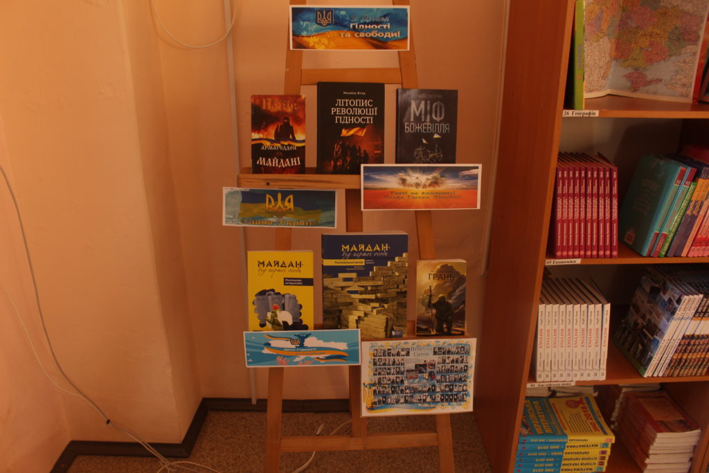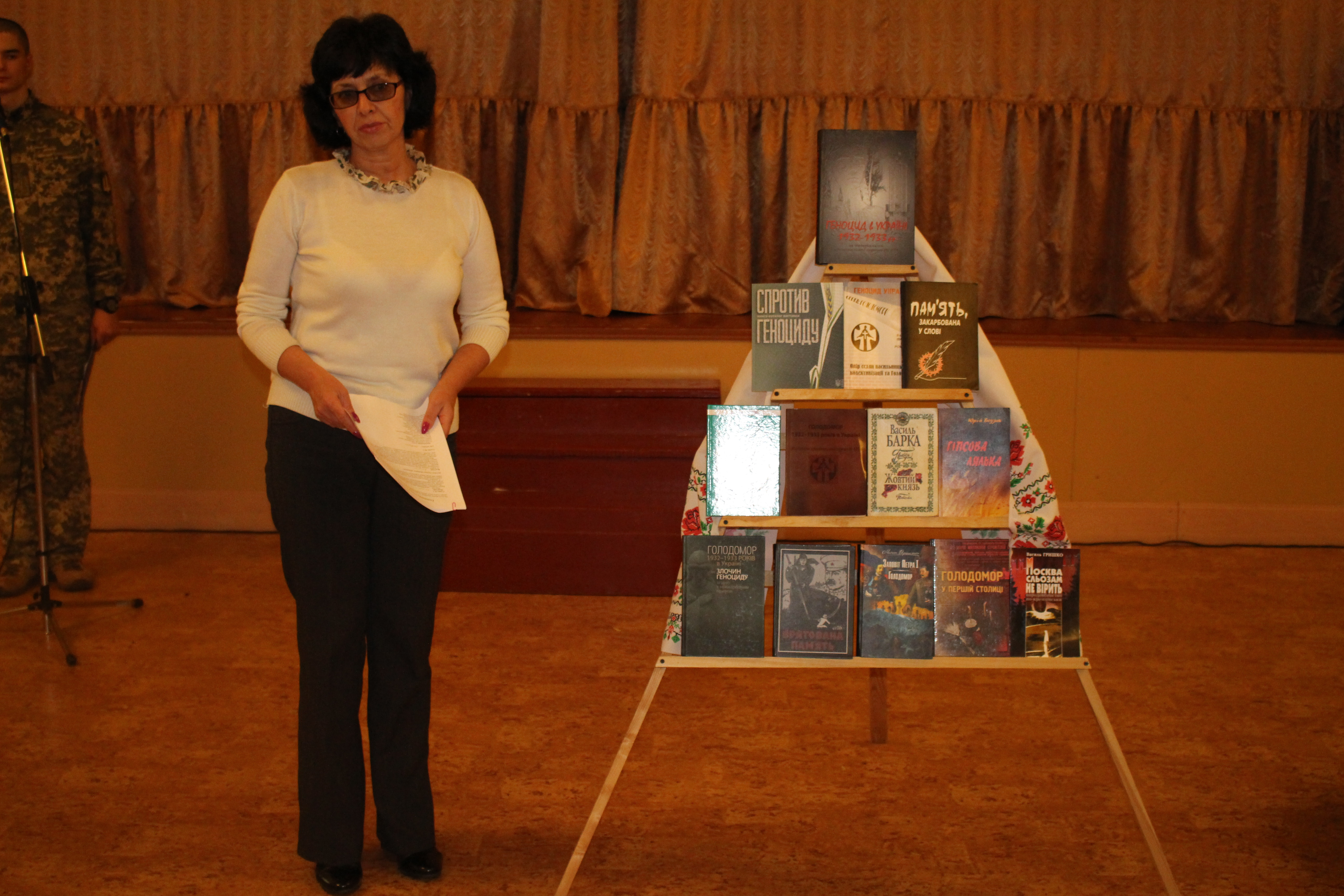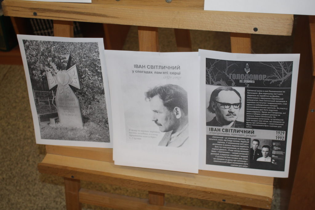 Книжково-ілюстративна виставка “Голодомор 1933…” розповіла присутнім про глибокий слід, залишений Голодомором 1932-1933 рр. в історії України, накладається на слід від інших трагедій, що випали на долю українського народу у ХХ ст. Неможливо не відмітити документальні матеріали, свідчення очевидців, фото та деякі розсекречені архівні матеріали. Доповнювала виставку інсталяція з вишитих рушників, чорної хлібини, колосків пшениці та запаленої свічки – пам’яті.
